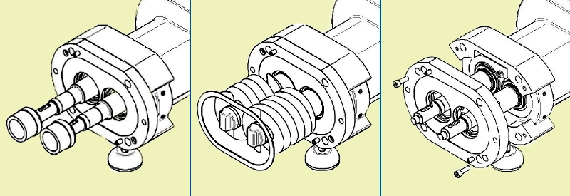 Linia śrubowa rotorów zapewnia brak występowania pulsacji. Przeniesienie napędu z silnika elektrycznego następuje poprzez odpowiednio ułożyskowane wały w synchronizatorze pompy.
