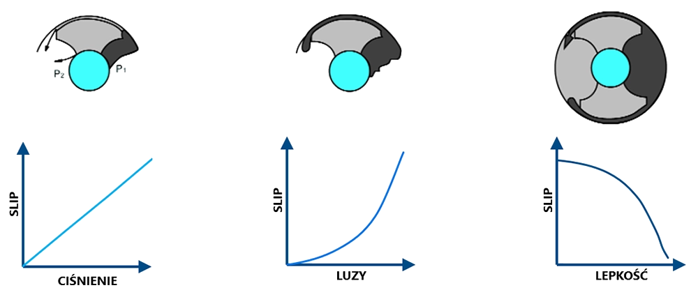 - Luzy – im większe luzy, czyli odległości między krzywkami a korpusem, tym większe zjawisko przepływu wstecznego.