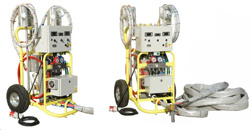 Izoler buduje maszyny do natrysku pianką poliuretanową wykorzystujące pompy zasilane sprężonym powietrzem. W każdym urządzeniu stosowane są dwie pompy wstępnego podawania składników (izocyjanianu oraz poliolu) na pompę wysokociśnieniową.