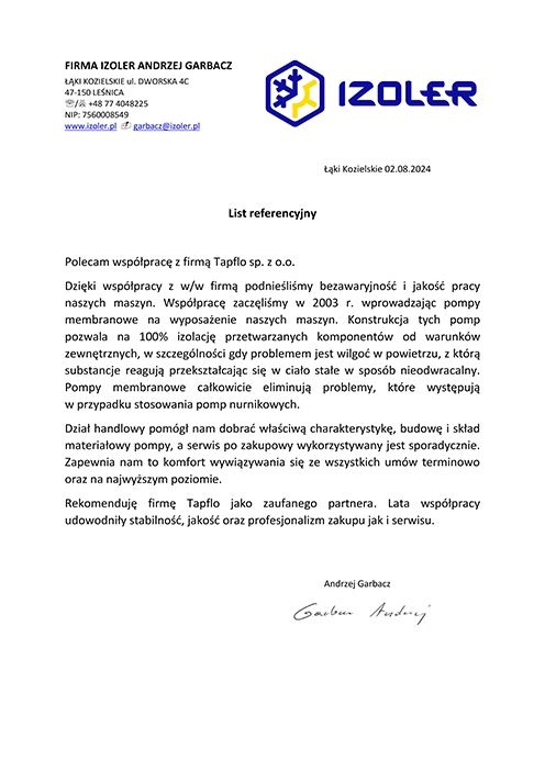 Polecam współpracę z firmą Tapflo sp. z o.o. Dzięki współpracy z w/w firmą podnieśliśmy bezawaryjność i jakość pracy naszych maszyn. Współpracę zaczęliśmy w 2003 r. wprowadzając pompy membranowe na wyposażenie naszych maszyn. Konstrukcja tych pomp pozwala na 100% izolację przetwarzanych komponentów od warunków zewnętrznych, w szczególności gdy problemem jest wilgoć w powietrzu, z którą substancje reagują przekształcając się w ciało stałe w sposób nieodwracalny. Pompy membranowe całkowicie eliminują problemy, które występują w przypadku stosowania pomp nurnikowych. Dział handlowy pomógł nam dobrać właściwą charakterystykę, budowę i skład materiałowy pompy, a serwis po zakupowy wykorzystywany jest sporadycznie. Zapewnia nam to komfort wywiązywania się ze wszystkich umów terminowo oraz na najwyższym poziomie. Rekomenduję firmę Tapflo jako zaufanego partnera. Lata współpracy udowodniły stabilność, jakość oraz profesjonalizm zakupu jak i serwisu.