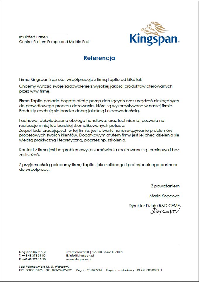 Firma Kingspan Sp.z o.o. współpracuje z firmą Tapflo od kilku lat. Chcemy wyrazić swoje zadowolenie z wysokiej jakości produktów oferowanych przez w/w firmę. Firma Tapflo posiada bogatą ofertę pomp dozujących oraz urządzeń niezbędnych do prawidłowego procesu dozowania, które są wykorzystywane w naszej firmie. Produkty cechują się bardzo dobrą jakością i niezawodnością. Fachowa, doświadczona obsługa handlowa, oraz techniczna, pozwala na realizacje mniej lub bardziej skomplikowanych potrzeb. Zespół ludzi pracujących w tej firmie, jest otwarty na rozwiązywanie problemów procesowych swoich klientów. Dodatkowym atutem firmy jest jej chęć dzielenia się wiedzą praktyczną i teoretyczną, poprzez np. szkolenia. Kontakt z firmą jest bezproblemowy, a zamówienia realizowane są terminowo i bez zastrzeżeń. Z przyjemnością polecamy firmę Tapflo, jako solidnego i profesjonalnego partnera do współpracy.