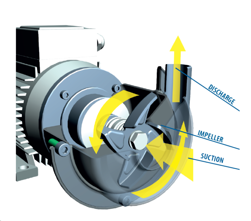 Energia ciśnienia powstaje częściowo przez wzrost energii kinetycznej cieczy, dzięki nadaniu tym cząsteczkom odpowiedniego przyspieszenia za pomocą wirnika. To zdarzenie powoduje występowanie kolejno zjawiska tłoczenia cieczy z wnętrza urządzenia pompującego wprost do przewodu tłocznego.