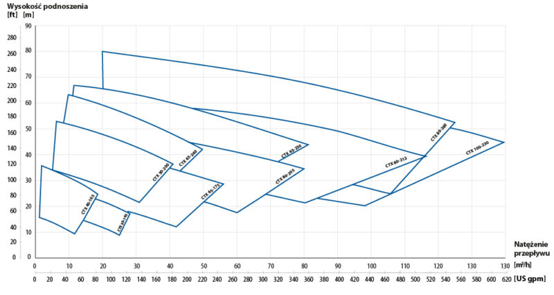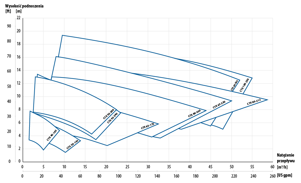 | Ciśnienie nominalne dla 20 °C | PN10 – CTX 40-165, CTX 50-145, CTX 50-200, CTX 65-175 PN16 – CTX 65-230, CTX 65-240, CTX 80-205, CTX 80-212, CTX 80-260, CTX 100-230 |