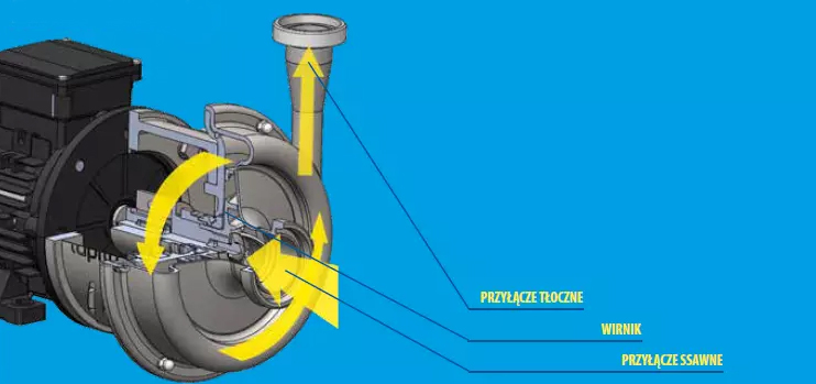 PRZYŁĄCZE SSAWNE – ciecz wpływa do korpusu pompy wzdłuż osi obrotu wirnika, który zapewnia odśrodkowe przyspieszenie cieczy.