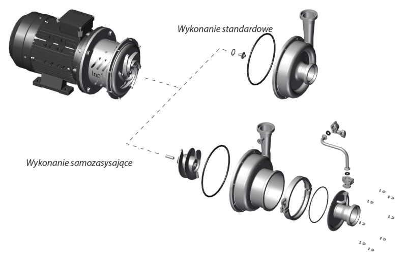 Opcja samozasysania jest łatwa do zaadaptowania w istniejących pompach poprzez wymianę przedniej pokrywy i dodanie śruby odpowietrzającej.