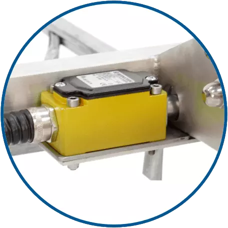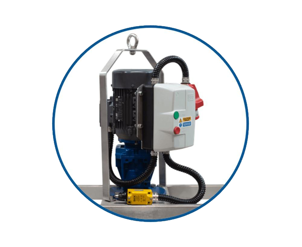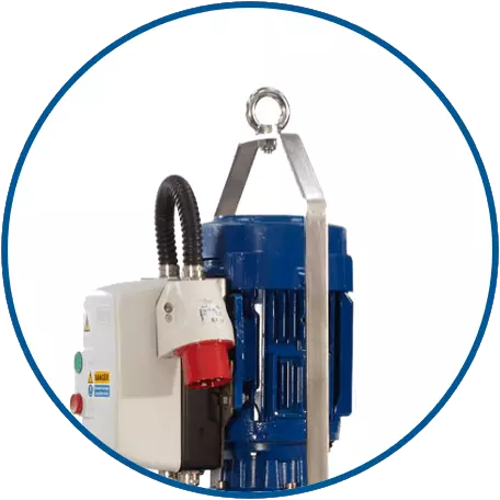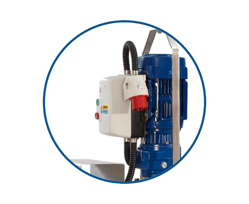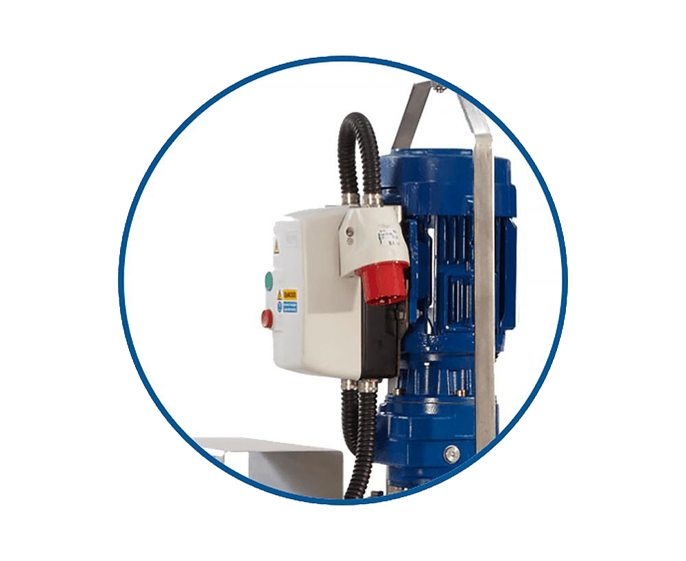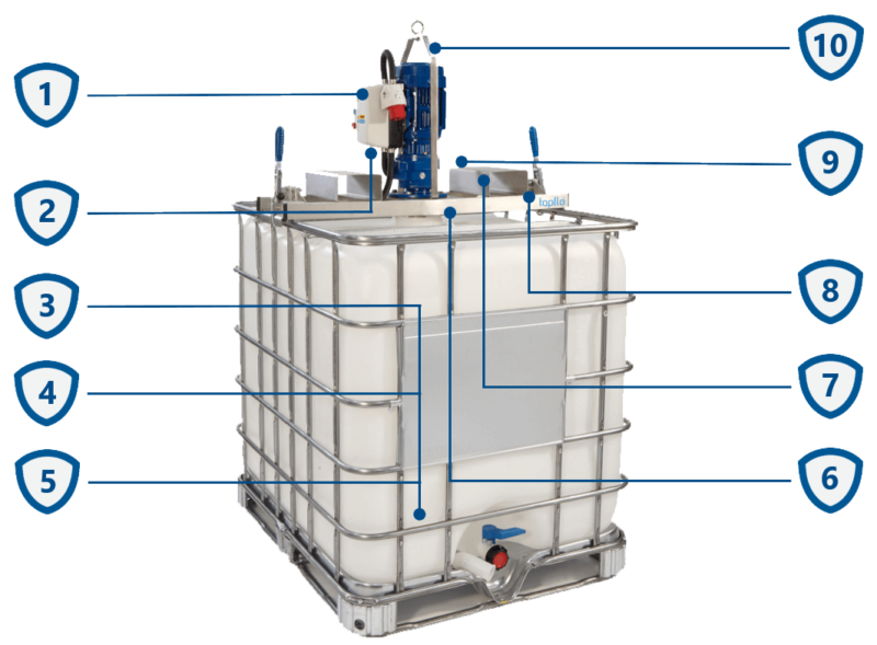 Mieszadła z napędem elektrycznym są bardzo ciche podczas pracy, dlatego wyposażamy je w wyłączniki bezpieczeństwa, które zatrzymują mieszadło w przypadku omyłkowego podniesienia jego ramy powyżej ramy paletopojemnika IBC.