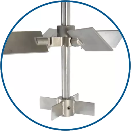 Taki wirnik podczas umieszczania go w zbiorniku jest złożony i swobodnie przechodzi przez otwór w zbiorniku. Po uruchomieniu mieszadła wirnik otwiera się, na skutek działania siły odśrodkowej zwiększa swoją powierzchnię i skutecznie miesza całą objętość zbiornika, także w przypadku cząstek stałych znajdujących się w medium. Ten typ wirnika stosowany jest z napędem wolnoobrotowym i może mieszać ciecze o lepkości nawet do 15.000 cP, lub do 20.000 cP w przypadku zastosowania dwóch wirników składanych zamontowanych na jednym wale. Wirnik wykonany jest ze stali nierdzewnej AISI 316. |