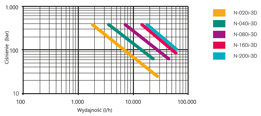| Wydajność pompy: | N-020: Qmaks. = 1730-26500 l/h N-040: Qmaks. = 3360-22900 l/h N-080: Qmaks. = 7070-44200 l/h N-160: Qmaks. = 14000-62300 l/h N-200: Qmaks. = 17500-62300 l/h*wartości teoretyczne przy 100% wydajności objętościowej i częstotliwości skoku 200 1/min, 50 Hz |