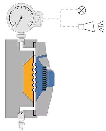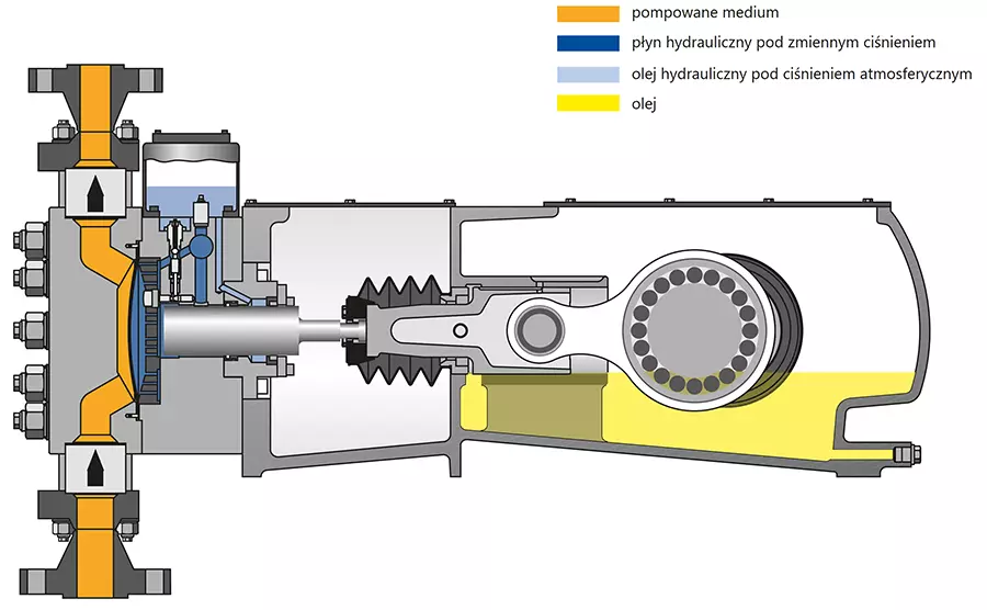 W przypadku pęknięcia membrany nie ma możliwości zanieczyszczenia krzyżowego oleju hydraulicznego i pompowanej cieczy. Ponadto nadal zapewnione jest zamknięcie pompowanej cieczy, co pozwala uniknąć natychmiastowej konieczności wyłączenia pompy.