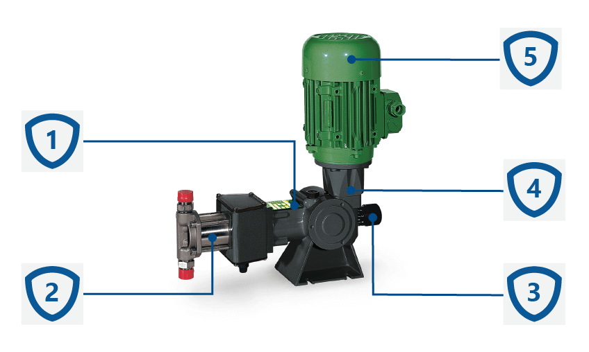 Głowice pomp tłokowych mogą być wykonane w różnych wersjach materiałowych w zależności od dozowanej cieczy. Kołnierz mocujący głowicy pompy jest otwarty od dołu i od góry, a także jest wyposażony w osłony ograniczające dostęp do ruchomego suwaka. Dolna osłona wyposażona jest w króciec na wąż do zbierania cieczy w przypadku wycieku z głowicy pompy na wypadek zużycia uszczelki lub oleju z mechanizmu.
