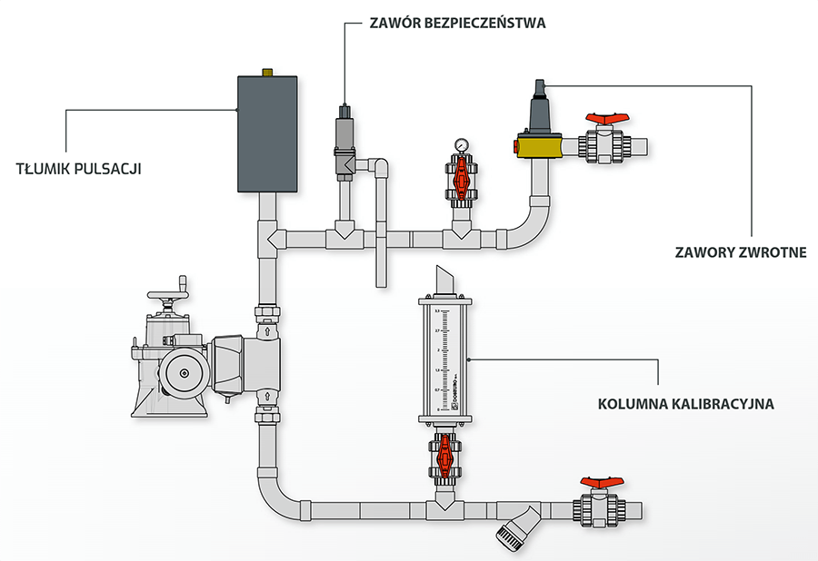 Kolumna kalibracyjna jest instalowana na linii ssawnej pompy dozującej. Składa się z cylindra z podziałką. Jego funkcją jest określenie natężenia przepływu pompy, sprawdzając objętość cieczy zasysanej w danym czasie, w rzeczywistych warunkach użytkowania.