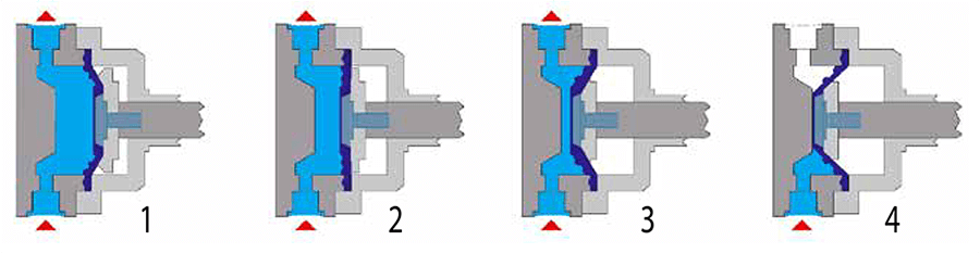 Korpus z PVC, składający się z dwóch części połączonych specjalnym wężem, który pod wpływem ciśnienia dynamicznego ma tendencję do samoczynnego zamykania się: + 50 °C. Membrany są kompatybilne z cieczą procesową.
