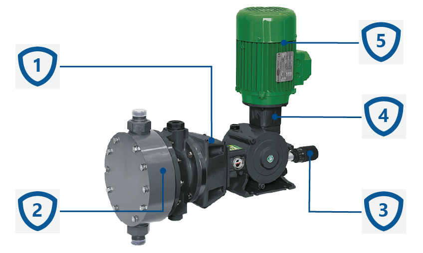 | 2. Głowica pompy hydraulicznej | Zasysa ciecz z zaworu wlotowego i przepycha ją przez zawór tłoczny za pomocą membrany wykonanej z PTFE/NBR. Na życzenie dostępne są różne jednostki wielogłowicowe. Każdy element pompujący ma niezależną regulację podczas pracy lub postoju. |