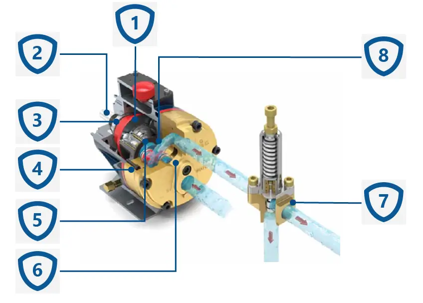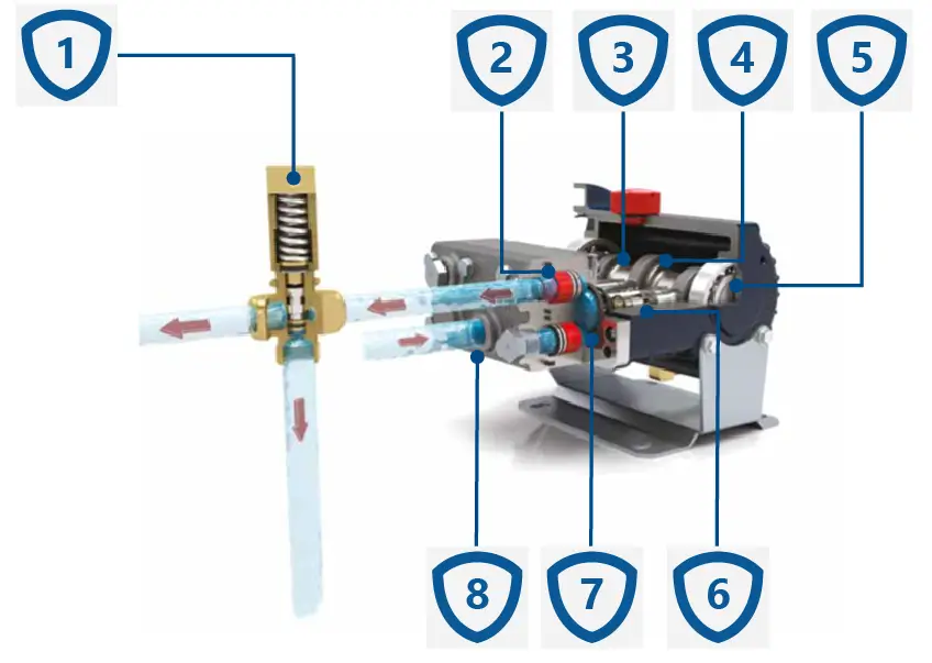 Równomiernie rozmieszczone membrany uruchamiane są kolejno, aby zapewnić stabilny przepływ o niskiej pulsacji. Aby zapewnić regulację ciśnienia, standardowo instaluje się zawór regulacyjny (1) na wylocie z pompy.