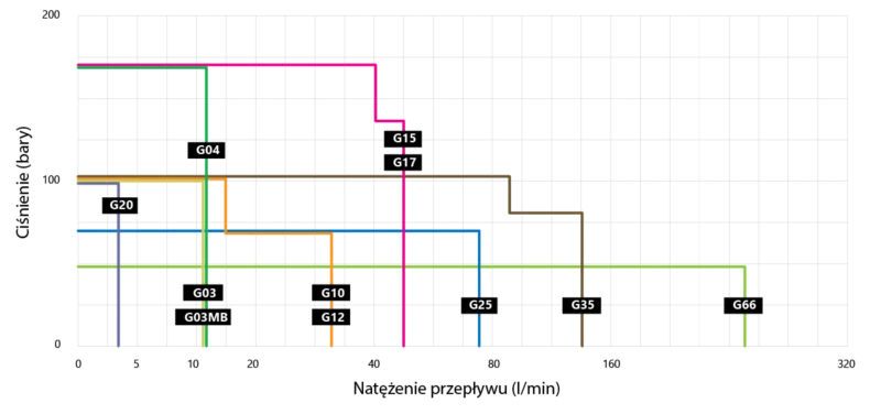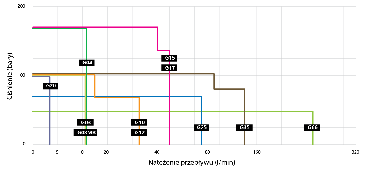 | Wydajność pompy: | G20: Qmax = 3,8 l/min G03: Qmax = 11,7 l/min G04: Qmax = 11,2 l/min G10: Qmax = 33,4 l/min G12: Qmax = 33,4 l/min G15/G17: Qmax = 58,7 l/min G25: Qmax = 75,9 l/min G35: Qmax = 138 l/min G66: Qmax = 236,6 l/min |