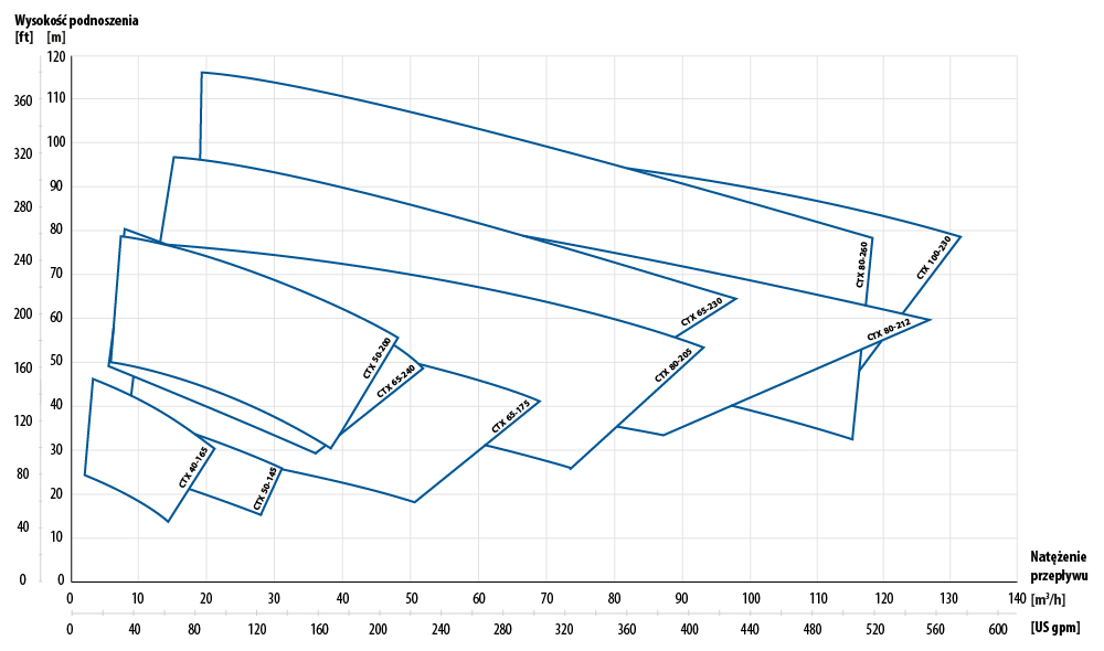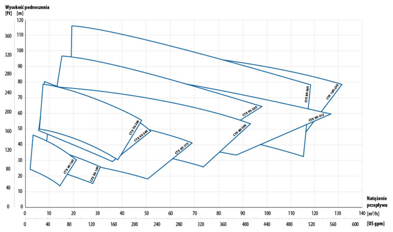 Konstrukcja pomp CTX jest oparta na „modułowej koncepcji”, która przekłada się na większą elastyczność w doborze, a także ułatwioną i tańszą modernizację oraz konserwację. Dostępne rozmiary pozwalają na osiągniecie natężenia przepływu do 132 m3/h i maksymalnej wysokości tłoczenia do 100 m. W porównaniu do swoich odpowiedników z gamy CTI i CTH – pompy serii CTX-I i CTX-H mogą osiągać wyższe ciśnienia i są dostępne w większych rozmiarach, co zapewnia bardziej wszechstronny zakres przepływu.