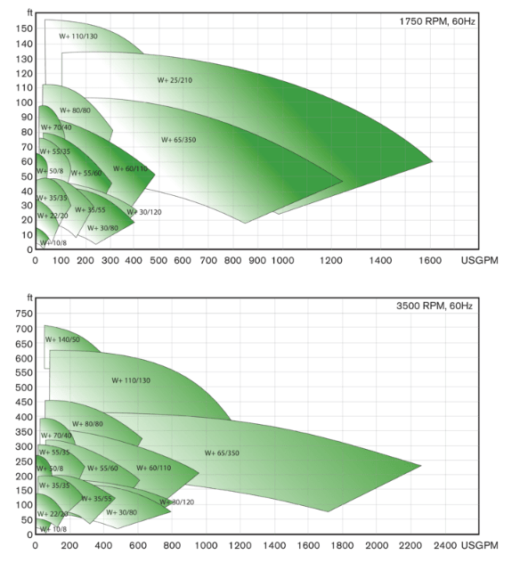 | Maks. ciśnienie tłoczenia | 18 barów: W+10/8, W+22/20, W+30/80, W+35/55, W+35/35, W+110/130 14 barów: W+25/210, W+30/120, W+50/8, W+55/35, W+55/60, W+60/110, W+65/350, W+70/40, W+80/80 Opcjonalnie: pierścień zaciskowy do dużych obciążeń, zwiększający maksymalne ciśnienie wylotowe do 20-25 barów w zależności od modelu. |