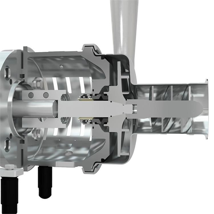 Na wlocie do maszyny znajduje się układ ze śrubą przypominający kształtem ślimaka, tak zwany inducer. Polepsza on warunki napływu na pompę i zmniejsza ryzyko powstawania kawitacji, co przekłada się na wysoką sprawność oraz jakość pracy urządzenia. Inducer zmniejsza zagrożenie zniszczenia struktury transportowanej cieczy i umożliwia pracę z aplikacjami o wyższej lepkości.
