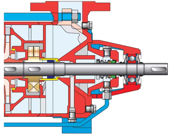 Stopień ciśnieniowy składa się z promieniowych kanałów dyfuzyjnych i dopasowanego do nich wirnika. Wymiary kołnierzy, średnica śrub i liczba otworów są zgodne z DIN 2535 ND 40. Pompy poziome napędzane są przez standardowy silnik na łapach IEC. Pompy pionowe napędzane są przez standardowy silnik kołnierzowy IEC, który jest podłączony do kołnierza mocującego pompy. Krawędź montażowa zapewnia, że osiowanie nie jest wymagane. W przypadku wszystkich pomp moc jest przekazywana przez elastyczne sprzęgło. Dostępne opcje uszczelnienia wału to uszczelnienia mechaniczne oraz dławnice.