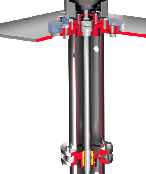 Zewnętrzne źródło czystej cieczy lub smaru smaruje wszystkie łożyska ślizgowe (dolne i pośrednie). Doskonałe rozwiązanie, gdy pompowana ciecz jest zanieczyszczona, lepka lub z zawieszonymi cząstkami stałymi. Wykonanie to pozwala na pracę bez cieczy w zbiorniku; ciecz dostarczana z zewnątrz pompowana jest wraz z głównym medium. | Wykonanie przeznaczone do cieczy agresywnych chemicznie, lepkich, zawierających cząstki stałe. Uszczelnienie mechaniczne umieszczone jest pomiędzy wałem, a pokrywą korpusu, aby umożliwić zalanie kolumny pompy. Łożyska ślizgowe (dolne i pośrednie) smarowane są przez ciecz zewnętrzną. Przed uruchomieniem kolumna musi być napełniona cieczą smarującą. |