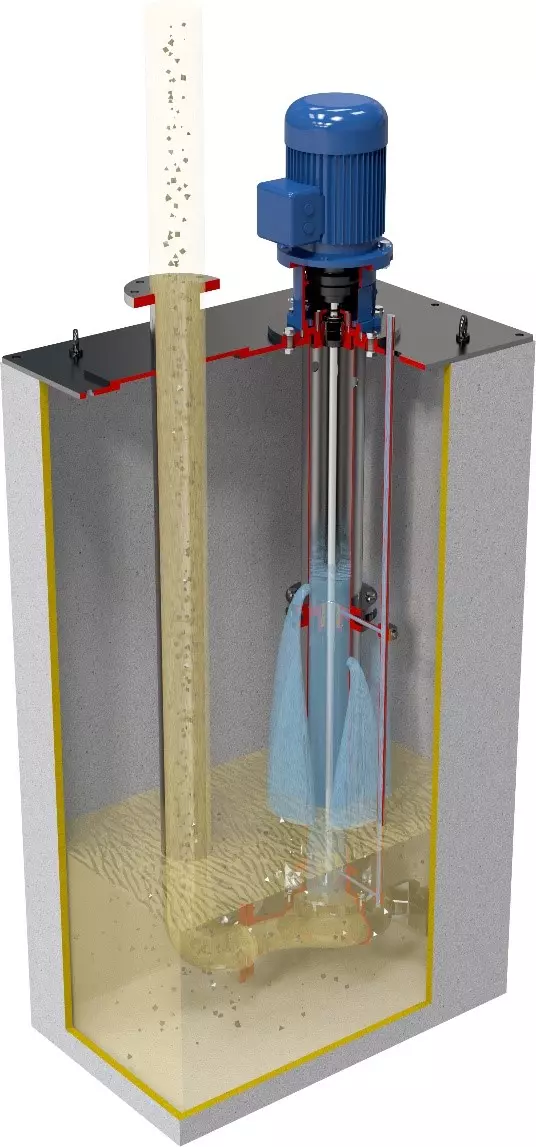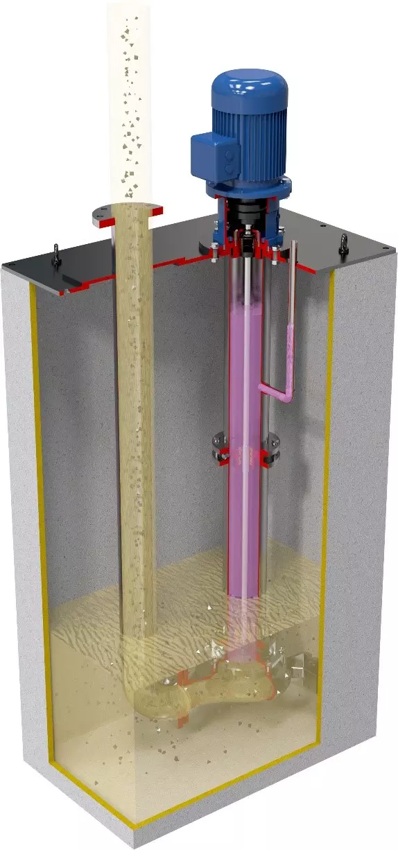 Pionowe pompy zanurzalne zgodne z ISO 5199 z wałem z łożyskami pośrednimi. Korpus pompy jest zanurzony w pompowanej cieczy, podczas gdy silnik jest zamontowany nad płytą, co oddziela go od pompowanej cieczy. Rura tłoczna jest oddzielona od kolumny pompy, a smarowanie łożysk na wale odbywa się zwykle przy użyciu tej samej pompowanej cieczy lub przy użyciu czystego smaru zewnętrznego (w przypadku agresywnych cieczy możliwe jest zastosowanie spłukiwania z zewnętrznego obiegu za pomocą czystej cieczy lub smaru).