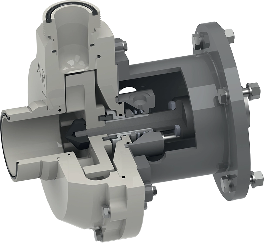Obrotowy pierścień uszczelniający wykonany jest z GR-PTFE lub węglika krzemu i jest zamontowany na wirniku. Żaden element uszczelnienia nie dotyka tulei wału pompy ani korpusu pompy. Dlatego części zużywające się są ograniczone do pierścieni uszczelniających i ich elastomerów. |
