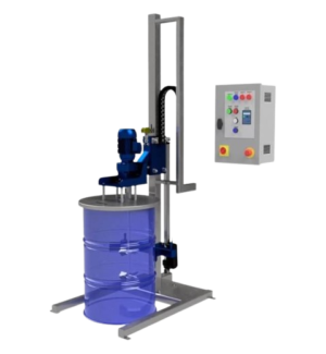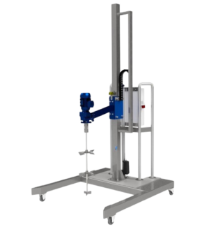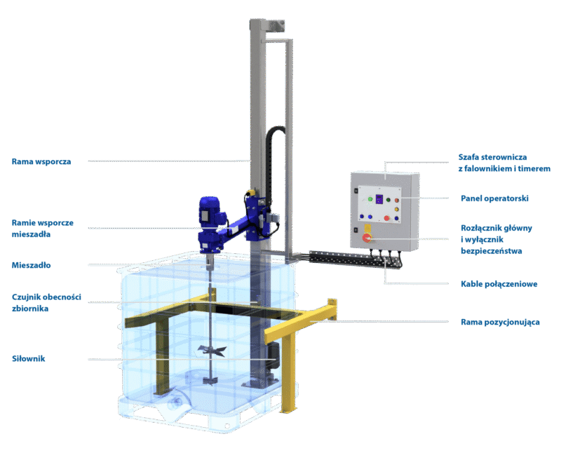 W trakcie mieszania operator może wykonywać inne czynności, a po zakończonym mieszaniu urządzenie wyłączy się i zasygnalizuje koniec procesu mieszania. Dzięki funkcji timera można dokładnie ustawiać czas mieszania odpowiedni dla danego produktu. Specjalnie zaprojektowana konstrukcja stacji pozwala na dokładne pozycjonowanie mieszadła nad zbiornikiem. Opuszczanie i podnoszenie mieszadła odbywa się z poziomu panelu sterowniczego połączonego z siłownikiem. Alternatywnie urządzenie może być dostarczone z wciągarką ręczną – lekką w obsłudze i przystosowaną do stosowania w strefach zagrożonych wybuchem (ATEX). W obu przypadkach mieszadło zabezpieczone jest przed niekontrolowanym opuszczeniem.