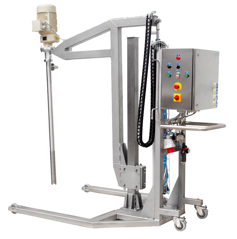 Na panelu sterowania operatorzy mogą płynnie przełączać się pomiędzy trybami pracy automatycznej i ręcznej. To centrum sterowania zapewnia również przyciski do ręcznej regulacji położenia pompy (RAISE lub LOWER – PODNIESIENIE lub OPUSZCZENIE) i zarządzania jej działaniem (START lub STOP). Ponadto użytkownik ma kontrolę nad prędkością pompowania i aktywacją sprężonego powietrza między pokrywą a beczką. Każdy panel sterowania jest wyposażony w główny przełącznik systemowy (ON/OFF) i przycisk awaryjnego zatrzymania bezpieczeństwa (E-STOP) dla zwiększenia bezpieczeństwa.
