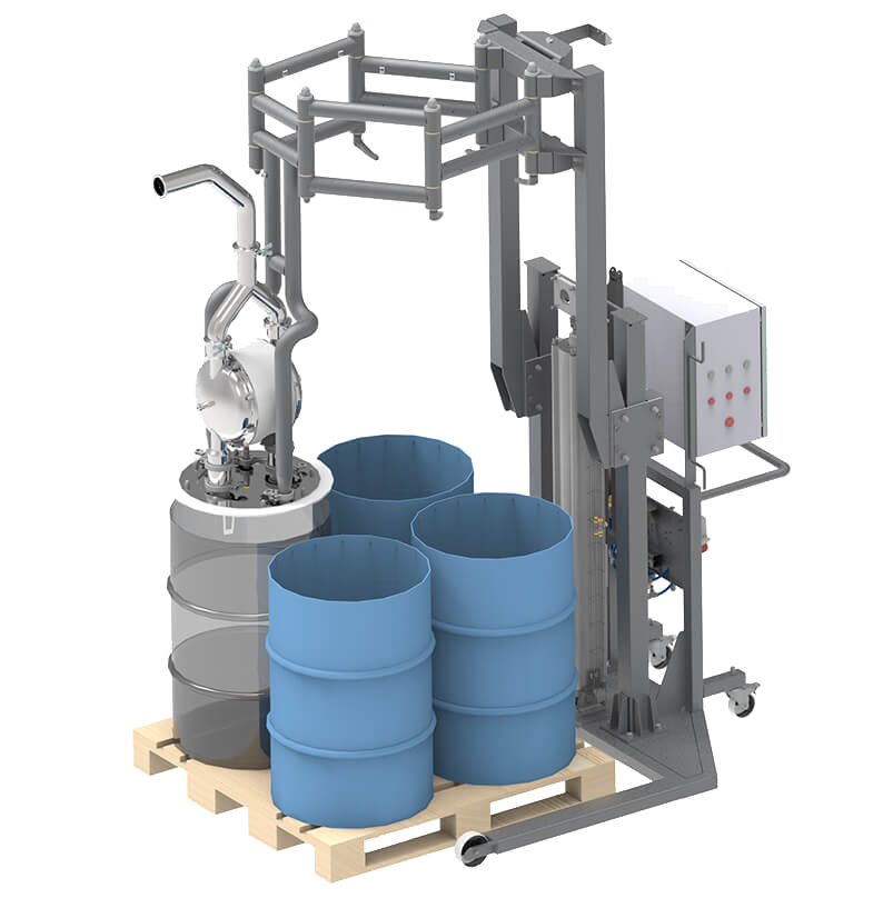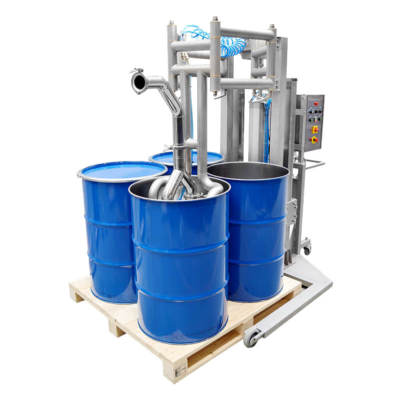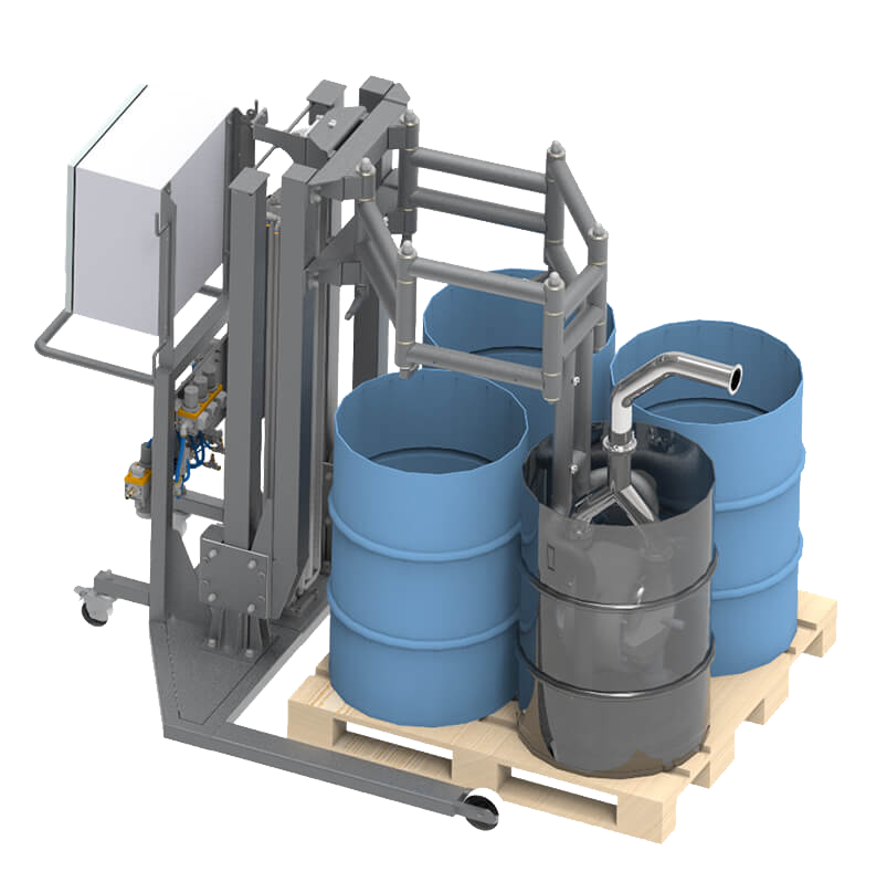 Nasz system jest wygodnie zamontowany na mobilnej ramie z 4 kołami, umożliwiając łatwy transport do miejsca przechowywania beczek. Po ustawieniu palety można bez wysiłku dostarczyć za pomocą wózka widłowego lub ręcznego wózka paletowego. Dzięki solidnej konstrukcji nośnej naszego systemu, precyzyjne umieszczenie palet jest bardzo łatwe, co umożliwia szybkie rozpoczęcie procesu.