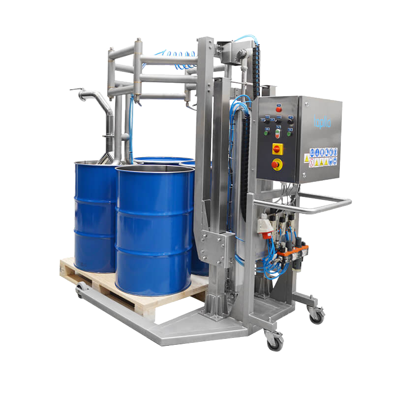 | System HVS Quattro z pompą podnoszoną i przenoszoną pomiędzy beczkami. Zaprojektowany do wydajnego rozładunku wielu beczek. | System HVS Quattro podczas rozładunku beczek. |