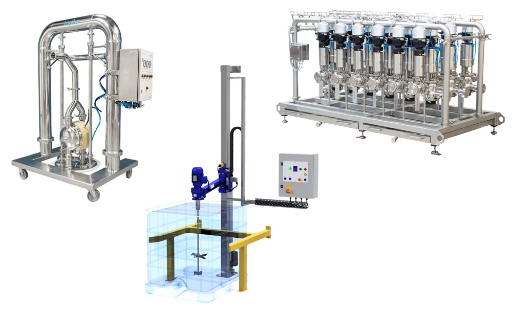 - Stacje mieszania do IBC i beczek – łatwe w obsłudze, zautomatyzowane systemy mieszania dostępne w wykonaniu stacjonarnym lub mobilnym. Stworzone do mieszania ze sobą różnych cieczy, lub cieczy z proszkami.